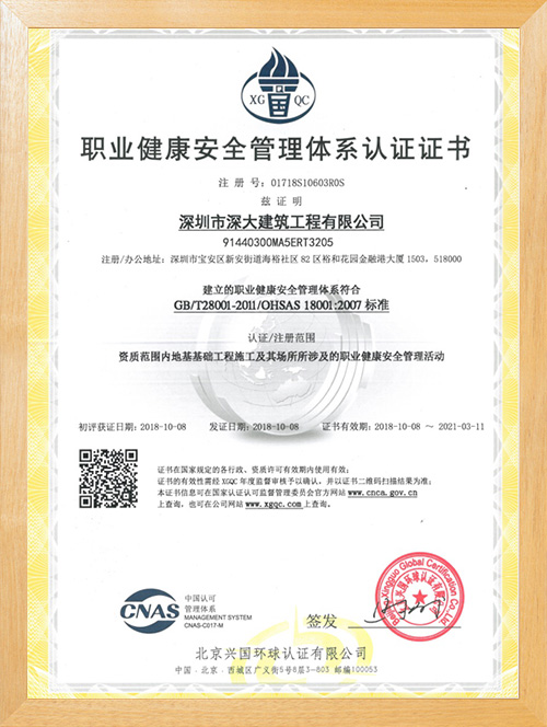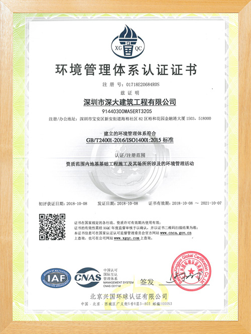 深圳市深大建筑工程有限公司,成立于2017年,注冊資本5000萬,總部位于深圳市寶安區(qū)中心地段。公司擁有地基基礎工程專業(yè)承包壹級資質,市政公用工程施工總承包二級資質,是一家一體化現代型企業(yè)。公司重視企業(yè)內部管理與發(fā)展,嚴格實施ISO管理體系,率先通過了ISO9001質量管理體系認證、環(huán)境管理體系及、職業(yè)健康安全管理體系的認證。為公司的長遠發(fā)展奠定了穩(wěn)健基礎。
